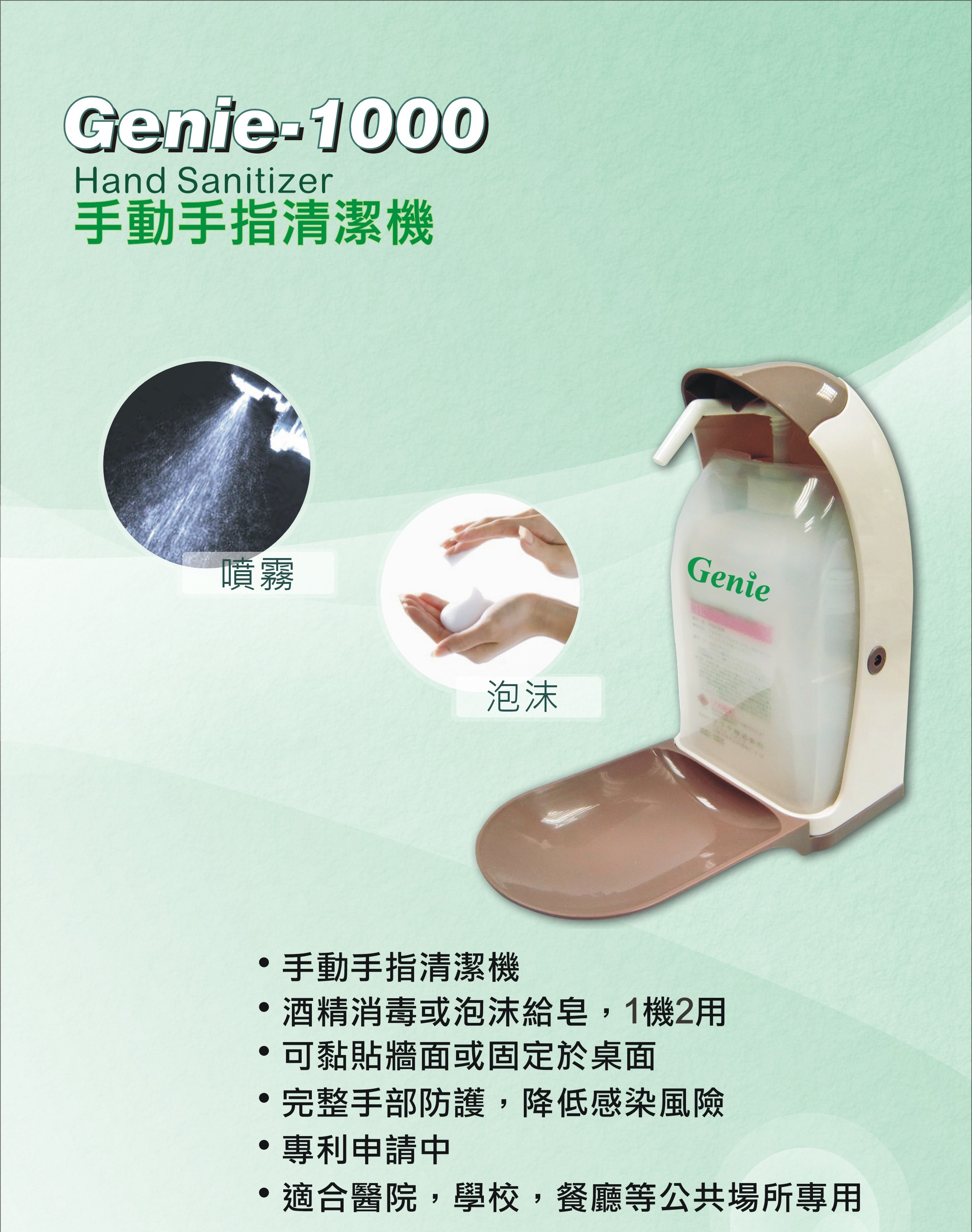 GENIE-1000A手動泡沫式給皂機/手動手指消毒器簡易說明